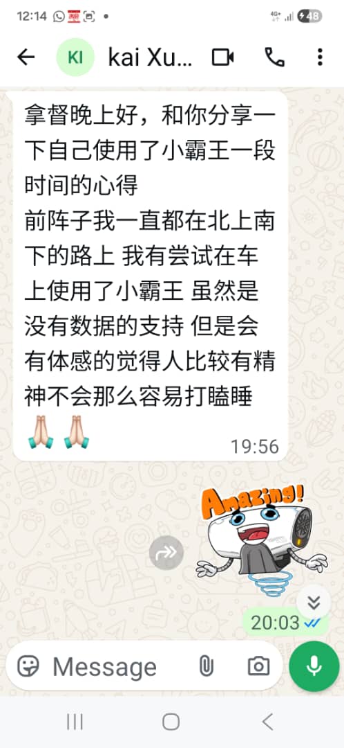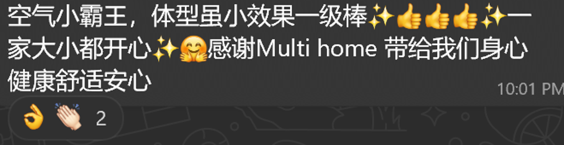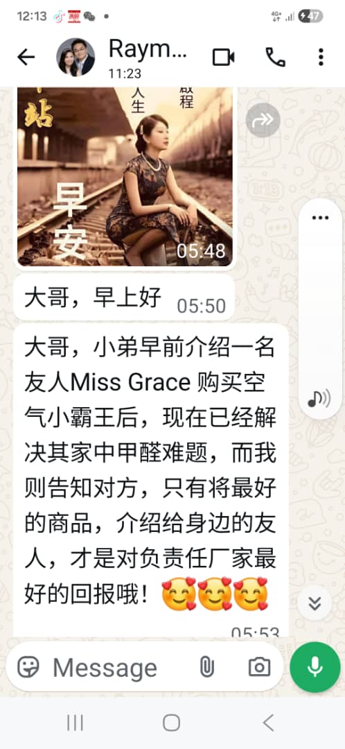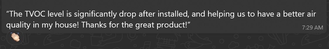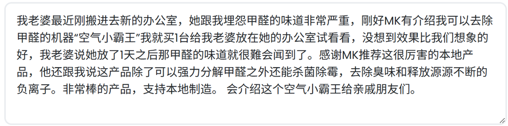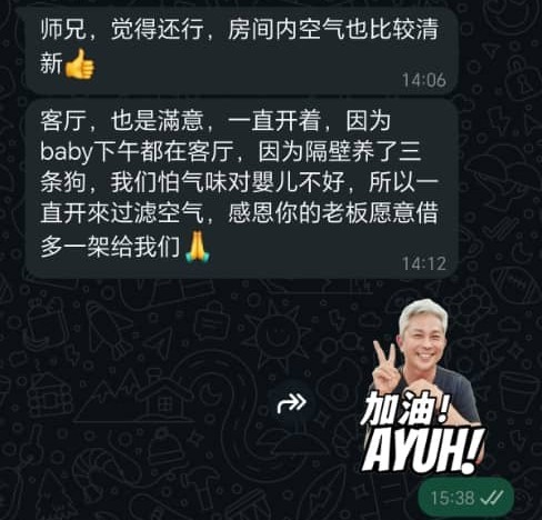 我老婆最近刚搬进去新的办公室,她跟我埋怨甲醛的味道非常严重,剛好MK有介绍我可以去除甲醛的机器“空气小霸王”我就买1台给我老婆放在她的办公室试看看,没想到效果比我们想象的好,我老婆说她放了1天之后那甲醛的味道就很難会闻到了。感谢MK推荐这很厉害的本地产品,他还跟我说这产品除了可以强力分解甲醛之外还能杀菌除霉,去除臭味和释放源源不断的负离子。非常棒的产品,支持本地制造。 会介绍这个空气小霸王给亲戚朋友们。