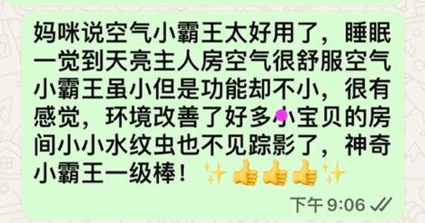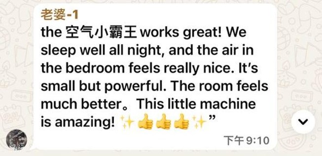 This 空气小霸王works great! We sleep well all night, and the air in the bedroom feels really nice. It’s small but powerful. This little machine is amazing!