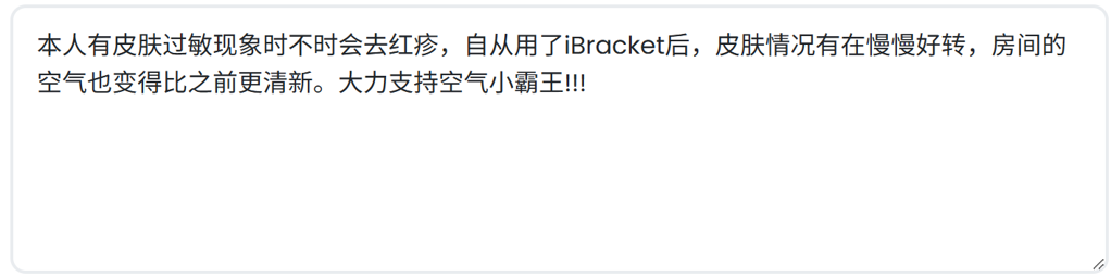 本人有皮肤过敏现象时不时会去红疹,自从用了iBracket后,皮肤情况有在慢慢好转,房间的空气也变得比之前更清新。大力支持空气小霸王
